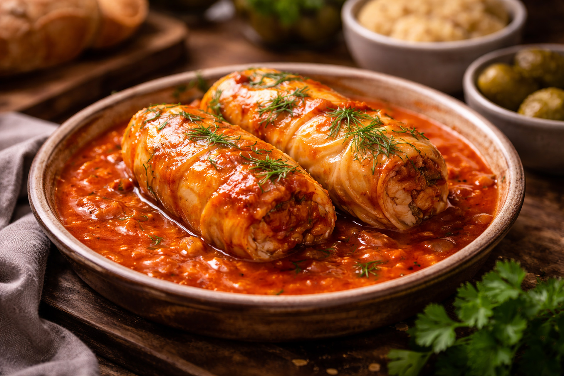 Stuffed cabbage rolls served in a rich tomato sauce.