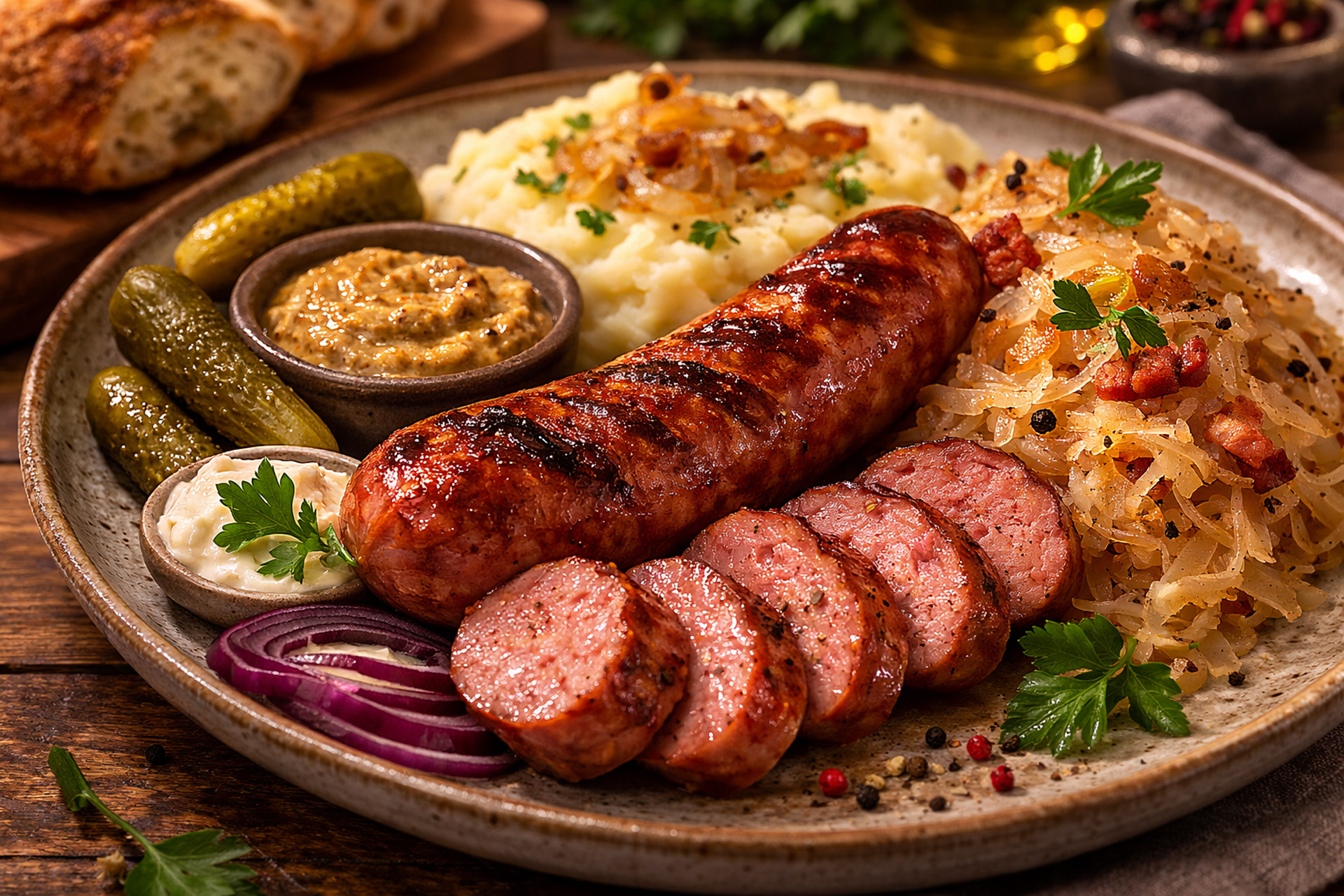 A signature expression of Polish flavor, this dish brings together savory sausage and traditional accompaniments in a warm, satisfying presentation. It is rustic, flavorful, and unmistakably comforting.