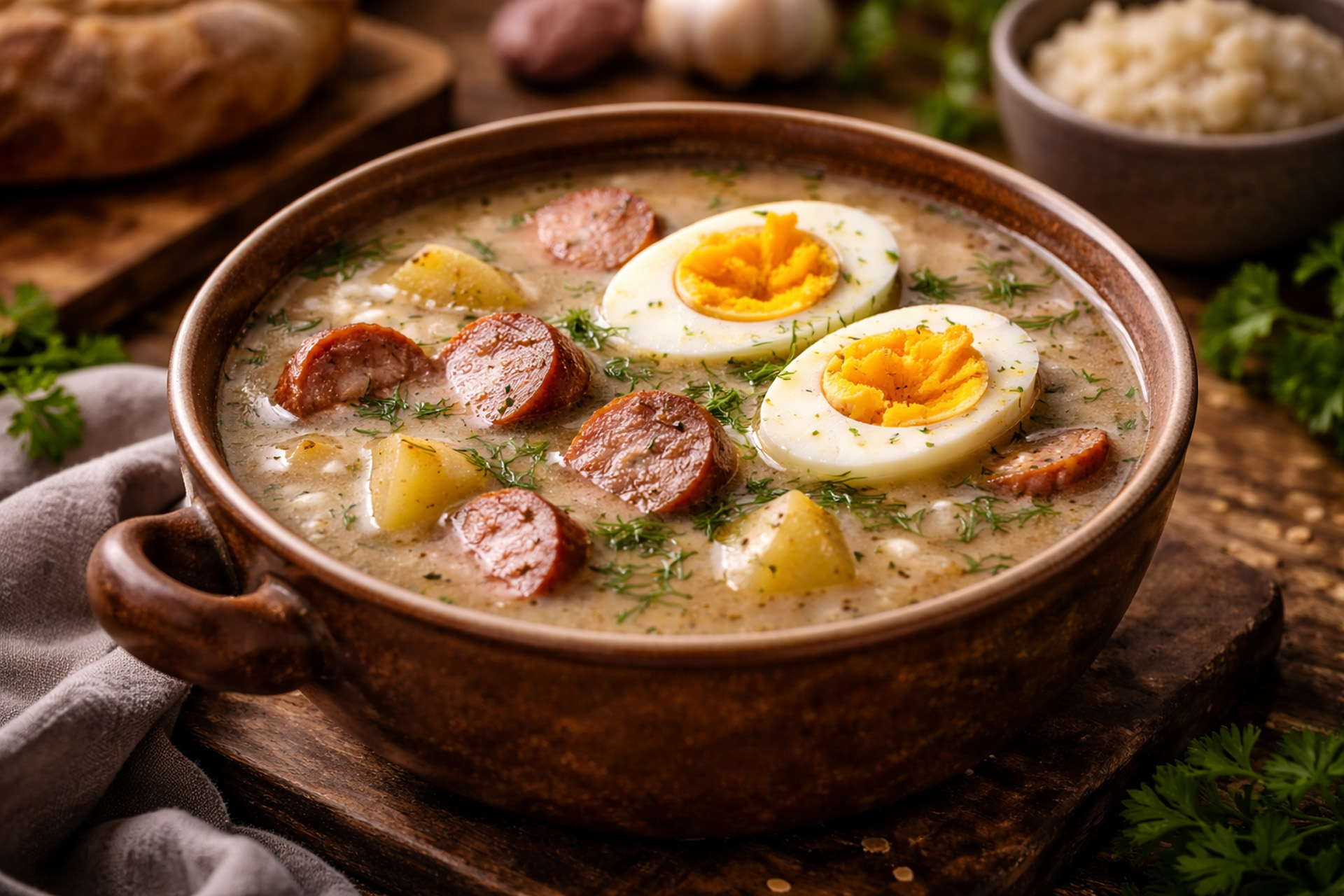 Traditional sour rye soup with sausage, egg, and potatoes.